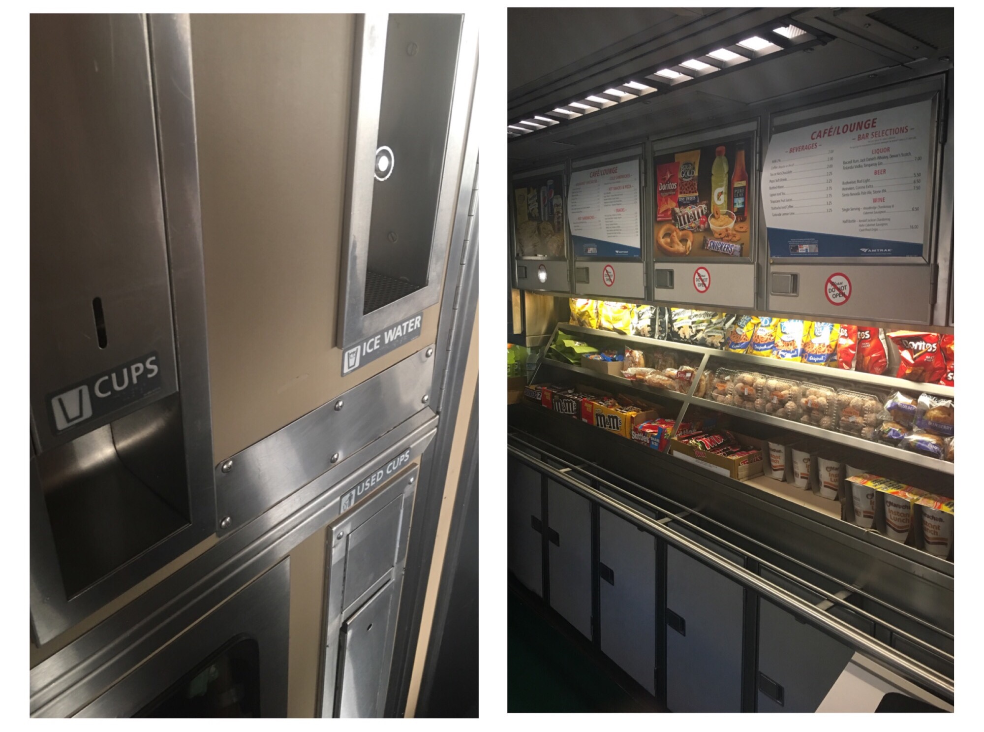 There was a water station on the wall of our car. There was also a snack bar available for munchies.  We weren’t completely happy with the food, so we called ahead for a pizza to be delivered to one of our stops along the way.  Woo hoo! Hot gourmet pizza on the train!  We felt so smart:)!